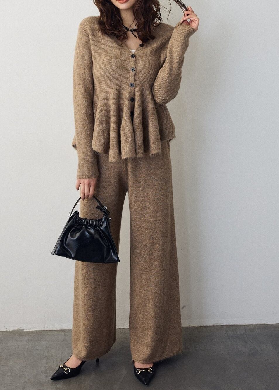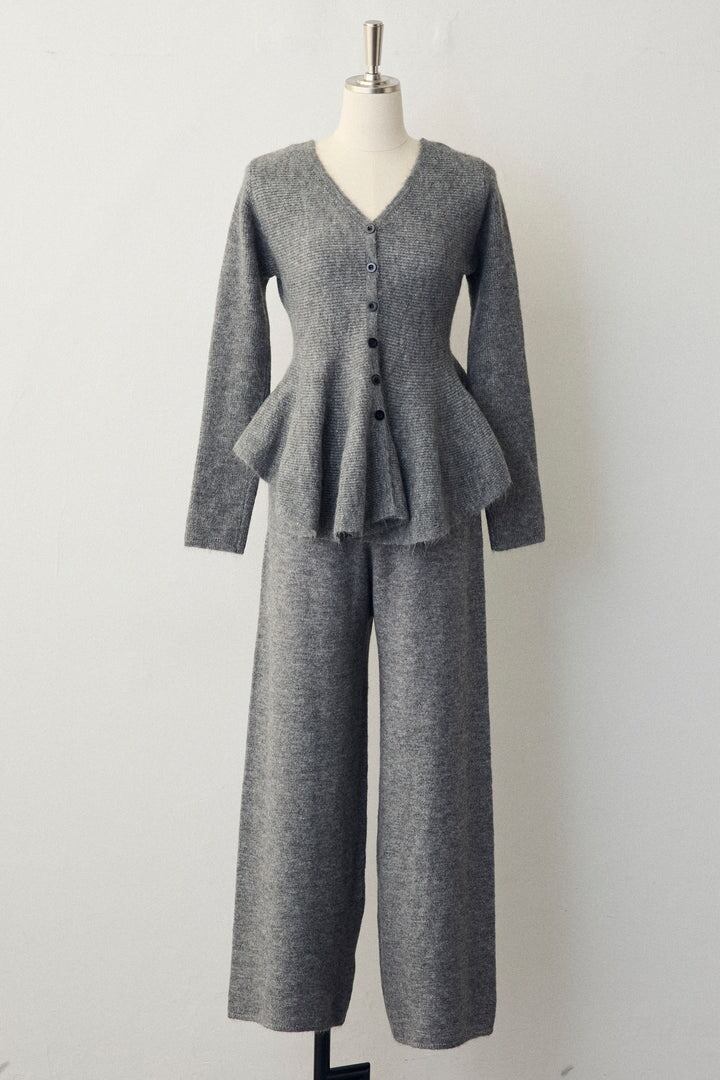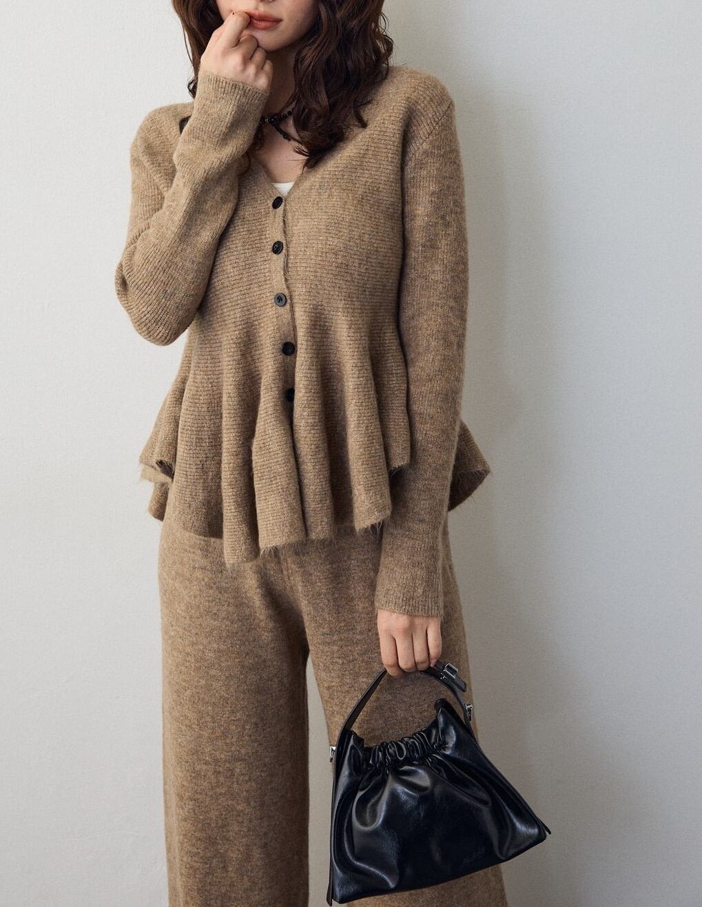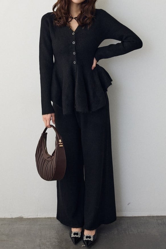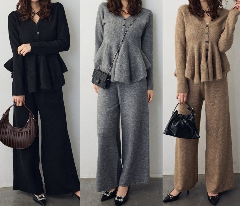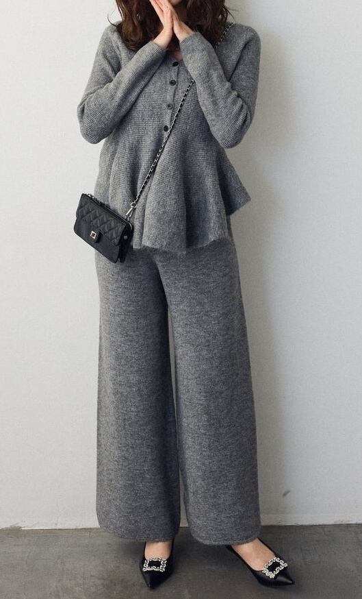 【サイズ】フリーサイズ:ニットセットアップ トップス:着丈57-61cm 肩幅30-33cm バス卜40-42cm 袖丈57-59cmパンツ:着丈94-99cm ウ工ス卜30-31cm 裾幅30-32cm